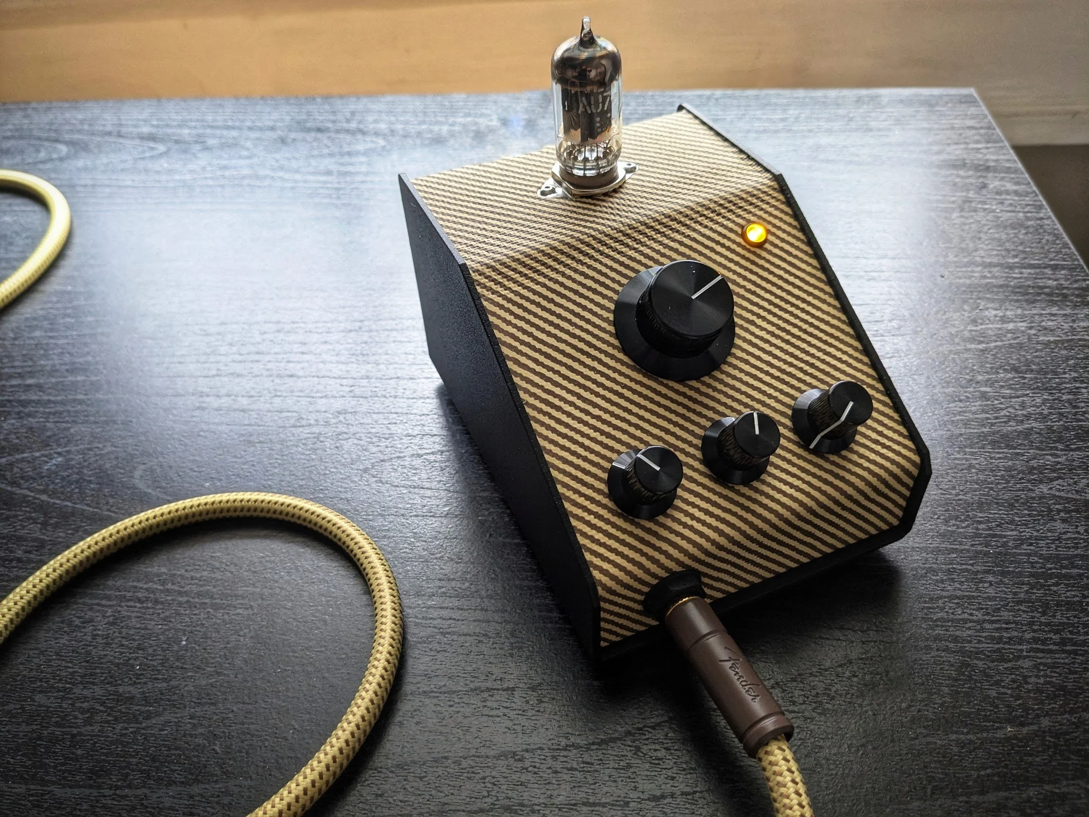 Rev-ette is a handmade 1-watt hybrid guitar amp that delivers real tube tone and distortion at only 12 volts. A JFET boost at the input effortlessly pushes the tube into overdrive.