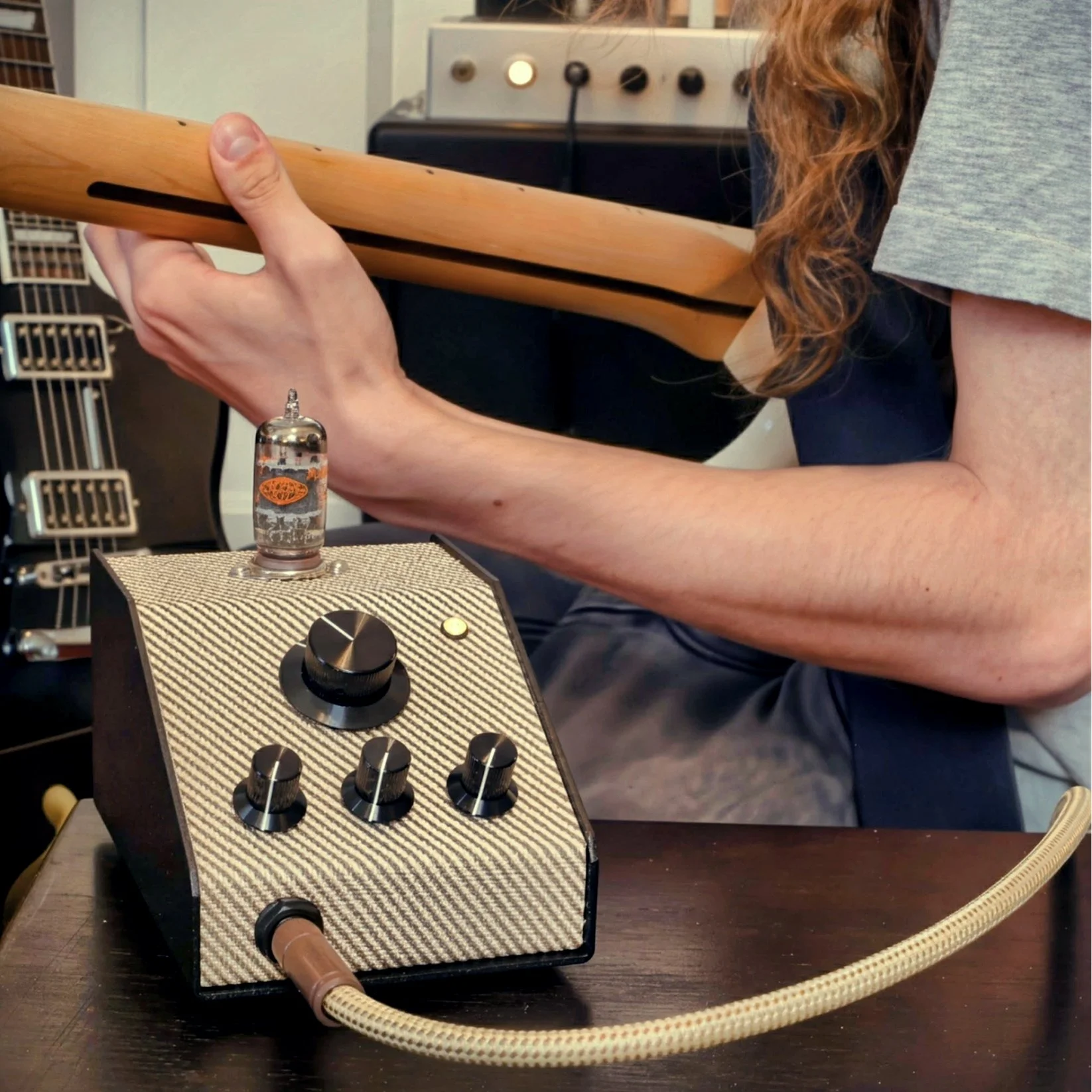 Rev-ette is a handmade 1-watt hybrid guitar amp that delivers authentic tube tone and distortion. A JFET boost at the input effortlessly pushes the tube into overdrive.